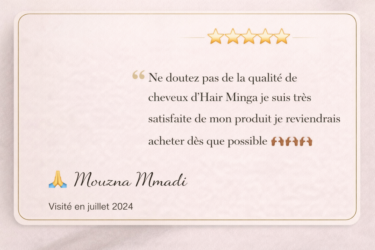 Chez Minga Hair, chaque femme est unique. Nous créons des cheveux humains naturels qui subliment votre identité et renforcent votre confiance, au quotidien